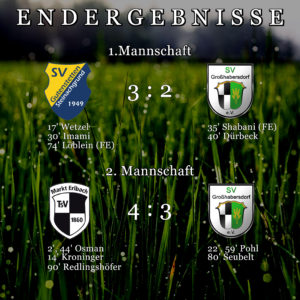 Mit insgesamt 10 fehlenden Spielern im Vergleich zur Vorwoche inklusive dem Trainer der 1. Mannschaft, mussten beide Teams einige Umstellungen hinnehmen. Bei der 1. kamen während des Spiels noch zwei weitere Verletzungen hinzu, die sich letztendlich nicht mehr kompensieren ließen. Die 2. musste sich erst durch ein Tor in der letzten Minute geschlagen geben. Insgesamt ein Wochenende das man abhaken und schnell vergessen sollte.
