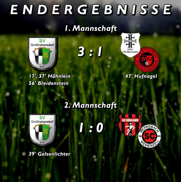 Die 2. Mannschaft gewinnt mit 1:0 und holt sich somit einen Spieltag vor Saisonende den Meisterschaftstitel in der B-Klasse. Nächste Woche geht es noch zum Jugendpartnerschaftsverein SV Bürglein. Die 1. sichert sich ebenso einen komfortablen Sieg, obwohl man das Spiel wegen zwei fragwürdigen gelb-roten Karten mit neun Mann beenden musste.