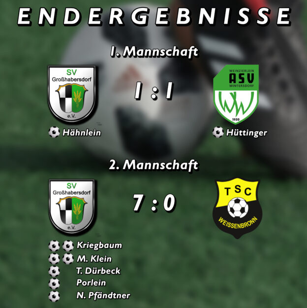 Die 2. Mannschaft untermauert die Aufstiegsambition mit einem 7:0 gegen den TSC Weißenbronn, die 1. muss sich nach einem Gegentor in der 81. Minute mit einem Punkt gegen den ASV Weinzierlein-Wintersdorf zufrieden geben.