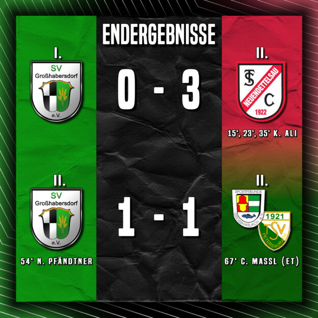 Mit mehr als 10 fehlenden und verletzten Spielern mussten beide Mannschaften am selben Tag stark ersatzgeschwächt gegen die jeweiligen Tabellenführer der Liga antreten. Die 2. Mannschaft hätte ihre Partie auch ohne Probleme gewinnen können, wenn eine bessere Chancenverwertung an den Tag gelegt worden wäre. Dem Gast gelang der Ausgleich nur durch einen unglücklich abgefälschten Ball. Die 1. Mannschaft leistete sich in der ersten Hälfte etwas zu viele Ungenauigkeiten, und konnte den Rückstand nicht mehr aufholen.